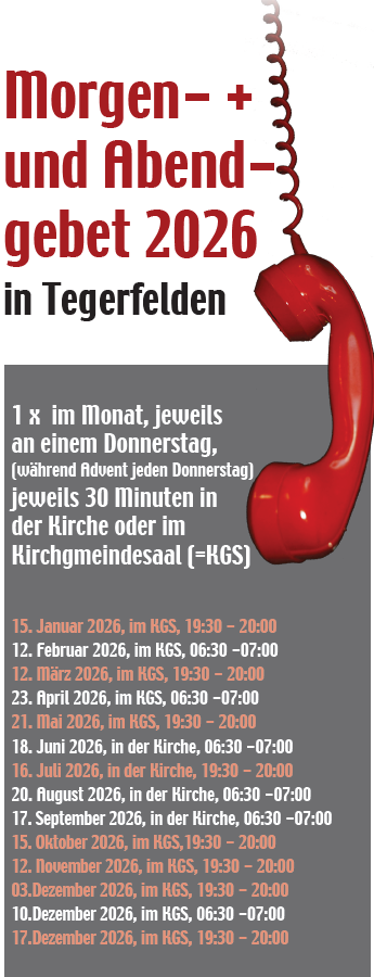 Herzliche Einladung zu diesen Gebetszeiten, die mal am Morgen und mal am Abend stattfinden